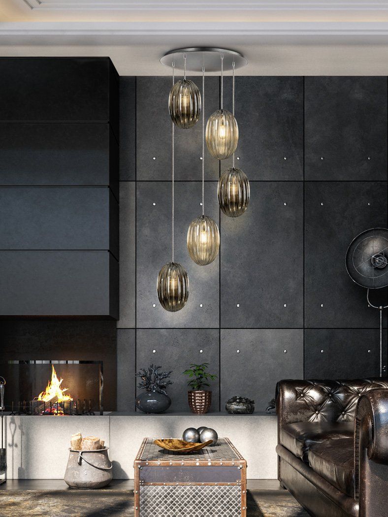 Lamp made of steel, bright finish. Shimmered glass shades with crystal beads stripes inside.