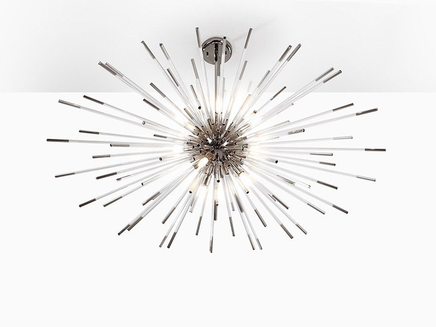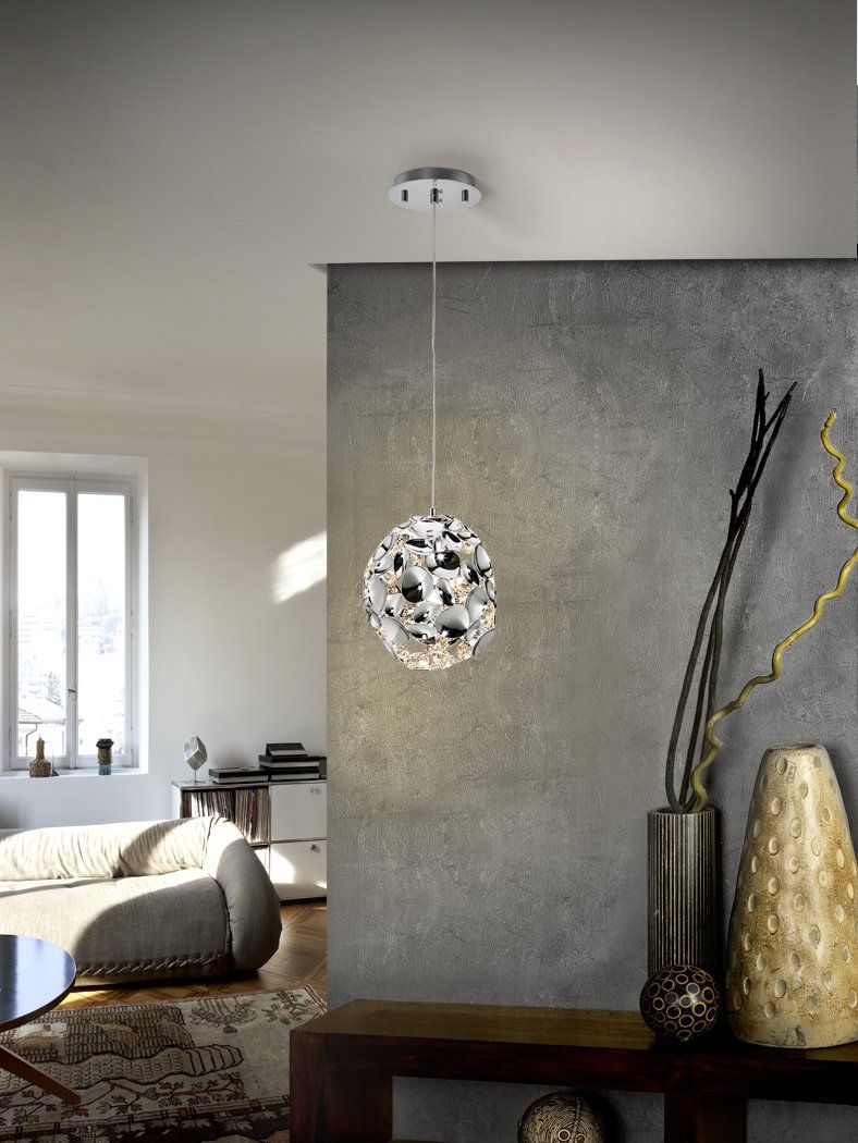 Lampada sferoidale a sospensione in metallo cromato. Aste a raggiera di vetro trasparente con le estremità placcate in cromo scuro. Regolabile in altezza.