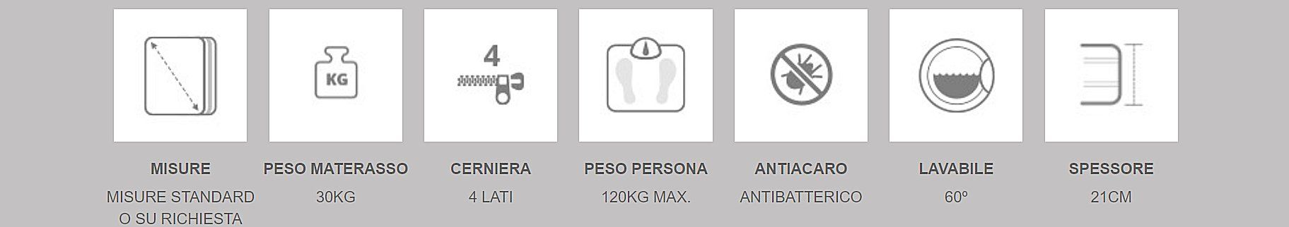 Composta da un lato superiore in MemoryFoam autoadattabile e due supporti in Ergolatex con differente elasticità.