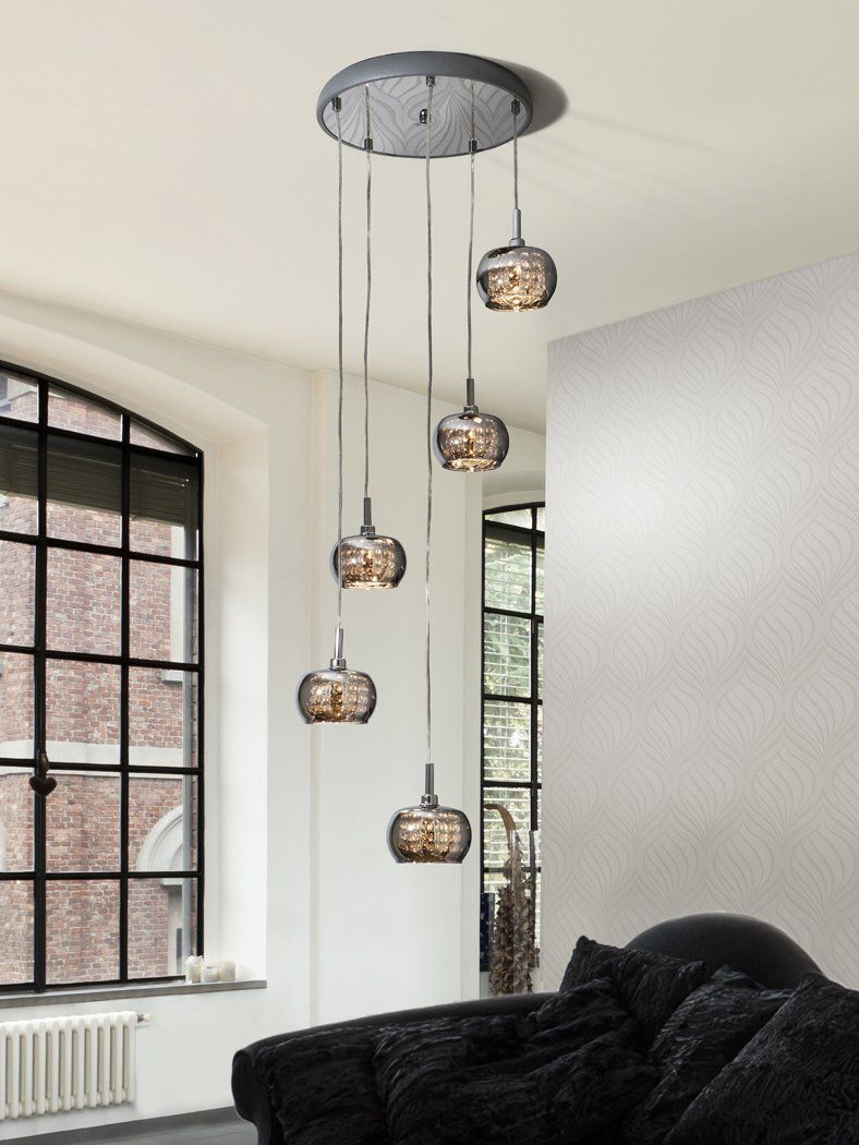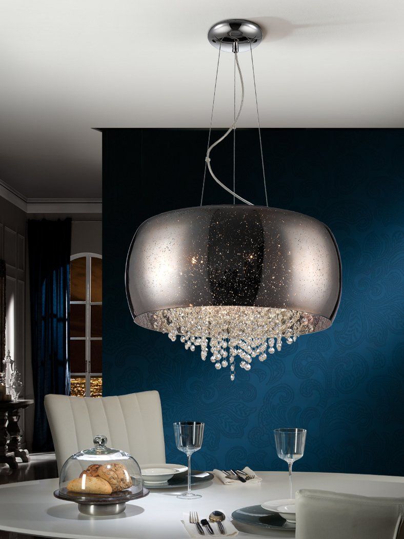 Lampada a sospensione a 4 luci LED, in metallo cromato. Paralumi doppi, parte esterna in vetro a specchio e interna in policarbonato trasparente a forma di cono scalare. Regolabile in altezza.
